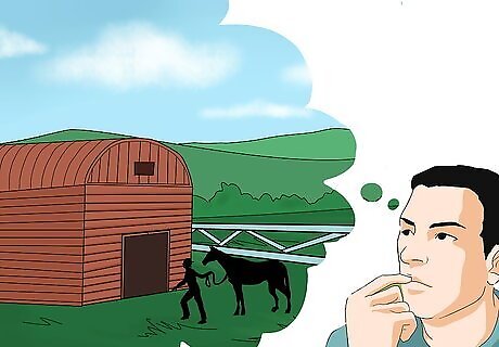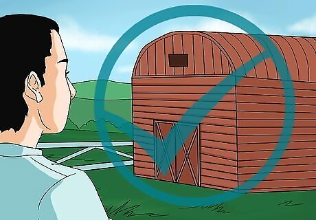 Decide where the horses are likely to be the safest. Will this be in a barn, in a particular field, or in some building not usually designated for the horses? If you aren't sure, ask people who do know to help you scout out the best locations to keep horses on your property during the emergency event. If your horses are used to staying in a stall or barn, look for a secure outdoor location for them. Putting your horses in an unfamiliar location or new type of housing can be extra stressful for them. If your property is likely to be flooded, do not keep the horses in a building. They will be more likely to survive if they can run to higher ground of their own accord. If using a barn or building, remove all hanging items and anything that could cause a threat to the scared horses. Keep the area as clear as possible. Keep the barn in a safe condition; replace anything loose or broken immediately upon discovery––regular maintenance is essential when living in an environment where emergency events are always possible.
