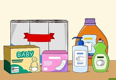 Purchase extras of essentials like toilet paper, soap, and detergent. It’s possible that you’ll need to stay home for several weeks if someone in your household is sick or your community has an outbreak. In case this happens, buy household items that you use on a regular basis so you won’t run out. Buy a month’s worth of supplies if possible so you're prepared. Here are some items you might purchase: Tissues—enough to cover your coughs and sneezes and handle blowing your nose Dish soap Hand soap Paper towels Toilet paper Laundry detergent Cleaning supplies Sanitary pads or tampons Toiletries Diapers Pet suppliesTip: Avoid overstocking on supplies. You only need about 2-4 weeks' worth. Remember, you want other people in your community to also have enough supplies to stay clean and isolate themselves if needed.