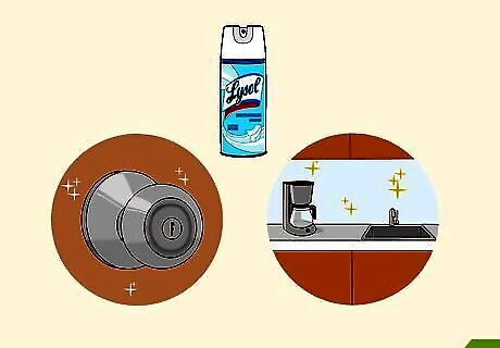 Disinfect surfaces before you touch them, both in public and at home. The CDC recommends keeping your home, workspace, and public areas as clean as possible. Spray a disinfectant over hard surfaces or wipe them down with a sanitary wipe. Whenever possible, spray soft surfaces with an appropriate disinfectant spray. For instance, spray Lysol over counters, railings, and doorknobs. Alternatively, use Clorox bleach wipes to clean these hard surfaces. Lysol also works on soft surfaces. Do not use vinegar or other "natural" cleaners, there is no good evidence that vinegar is effective against coronavirus. "Natural" cleaning products can have a variety of different ingredients and are not designed to be effective against viruses.