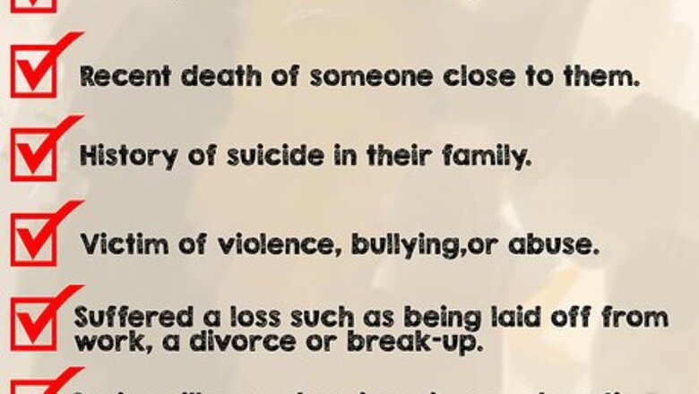 Pay attention to risk factors. There are some life events that make a person more likely to attempt suicide. If you know what to look for, you will have a better chance at preventing it from happening. Pay attention to the stressors going on in the person’s life and consider whether they might be placing the person at risk for suicide. Make a mental note of whether the person has attempted suicide in the past. You may have to just ask, “Have you ever considered suicide?” Be aware if anyone the person knows has recently died, especially from suicide. The death of someone close to them can cause some people to consider suicide. This is especially true for teenagers. Find out if there is history of suicide in their family. You may have to ask them directly or ask one of their family members. Pay attention if the person is or has been a victim of violence, bullying, humiliation, or abuse. These situations can lead a person to view suicide as an option. Notice if the person has suffered a loss such as being laid off from work, a divorce or break-up, or even if their reputation has been severely damaged. Be alert if the person has a serious illness such as chronic pain or exhaustion with no end in sight. Sometimes people view suicide as a way to end their pain.