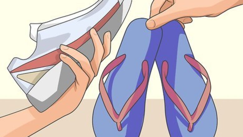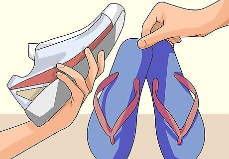 Wear shoes made of materials that will deter foot odor. Plastic and nylon shoes make it hard for your feet to ventilate, and can worsen odor. Choosing footwear made of leather, canvas, mesh and other breathable materials will help prevent odor. Wearing open-toed shoes in the summer (when it can be especially hot and/or humid) and going barefoot when at home will also help prevent foot odor.