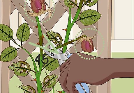 Deadhead blooms once they start to wilt to encourage new growth. When the petals start to fade, get limp, or go brown, the bloom is ready to be deadheaded. Cut the bloom off at a 45-degree angle where the stem meets the branch. Use clean pruning shears to ensure you’re not introducing any bacteria to your plant. Avoid simply pinching off the heads of dead blooms, as this can actually create wild new growth that is too thin to sustain future blooms. Some types of roses are “self-cleaning,” meaning the dead bloom will drop off on its own. If you’re not sure of what you have, keep an eye on the first set of blooms to see if they do come off on their own once they start to wilt. If not, deadhead them yourself.Did You Know: Stems that have minimal leaves make the biggest blooms because they have don’t have to divert as much energy to the production and feeding of leaves.