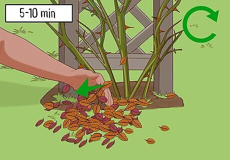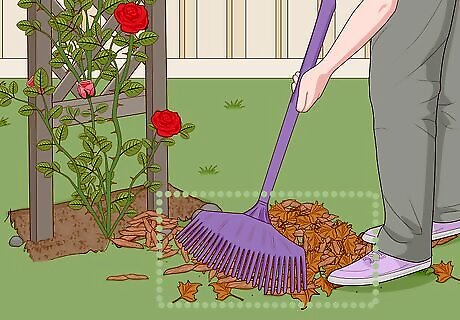 Clear away dead leaves and petals from the ground so the base is clear. Too much debris on the ground will make it harder for rainwater to reach the soil. Damp debris can also introduce rot and disease to your plants. Every week or so, do a quick sweep of the ground near your roses to keep it clear. If you stay on top of this task by addressing it every week, it should never take you longer than 5 to 10 minutes, just depending on how big your trellised area is.