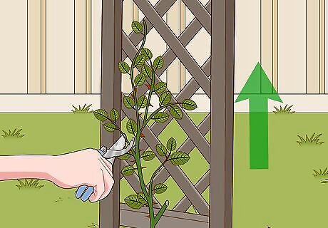 Secure the canes to the trellis to continue encouraging horizontal growth. Use strips of thin, stretchy material, like pantyhose cut into strips, to tie the branches close to the trellis. This will help them continue growing close to the trellis rather than expanding outwards as a rosebush does. Add enough ties to keep the branches close to the trellis. Tying them every 15 inches (38 cm) or so will provide more than enough security.