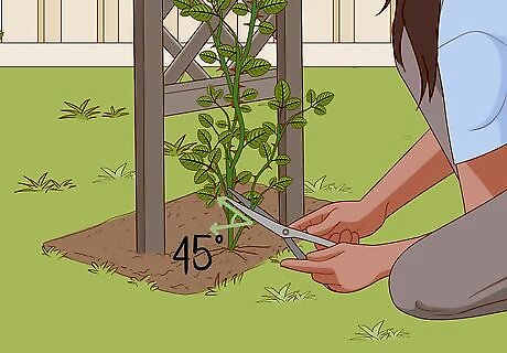 Cut back old canes and ones that are growing away from the trellis. Use your pruning shears to cut the canes at a 45-degree angle as close to the base as you can get. This will give the new spring growth a chance to get more sunlight. It may seem counterintuitive to cut away the oldest stems, but those are often the ones that are most susceptible to pests and diseases.Tip: Disinfect your shears with a 1:10 bleach-to-water solution before you start pruning.
