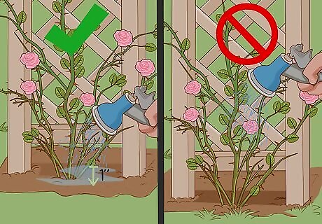 Water your roses every week if there hasn’t been any rain. Your roses need roughly 1 inch (2.5 cm) of rainfall every week, whether that comes from the actual rain or from a watering can. Disperse the water at the soil level and avoid getting the leaves and blooms overly wet, since that can cause them to get mildewy. Use a watering can rather than a hose so that the waterfall is gentle. A too-direct stream could erode the soil near the base of the plant. Or, if you do use a hose, use one that has a “watering” option so that the stream isn’t too strong.