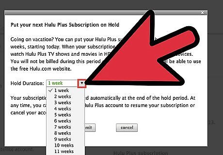 Select how many weeks you want to put your subscription on hold for. Keep in mind that the hold begins at the start of the next billing cycle and can be put in force for up to 12 weeks. During that time, you won't be charged a fee for your account, and you won't be able to watch any Hulu Plus shows. After the hold, your account will reactivate and Hulu will bill you the monthly fee once again. You can reactivate your account at any time. If you want to stop your Hulu Plus activity for longer, you can cancel your account altogether.