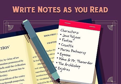 Write notes as you read. Keep notes on the book while you’re reading Les Mis. You may need to recall the information for a class or another juncture. By taking notes as you read, you can construct a built-in study aid. Taking notes is a delicate balancing act between getting too little and too much information. Don’t write down everything you read, only the most relevant information or details. Write your notes by hand. Studies have shown that people retain information more effectively writing notes instead of typing them in to a computer or recording them on a device.