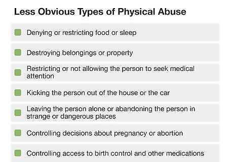 Recognize other types of physical abuse. Physical violence can be more than just choking, hitting, punching, or kicking. Other types of physical abuse include: Denying or restricting food or sleep Destroying belongings or property Restricting or not allowing the person to seek medical attention Kicking the person out of the house or the car Leaving the person alone or abandoning the person in strange or dangerous places Controlling access to birth control and other medications Controlling decisions about pregnancy or abortion