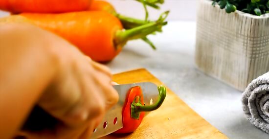 A lot of the stuff you probably cut off fruits and vegetables is edible. Instead of just chopping off the tops and bottoms of fruits and vegetables indiscriminately, use a paring knife to cut precisely around the stems. Carve the stem out of things like peppers, tomatoes, and strawberries. Cut as close to the stem as possible for things like carrots, celery, and onions. The stems of herbs like cilantro have a lot of flavor. Instead of using just the leaves, just remove the roots, and chop up all the leaves and stems together. As with peels, you can save these scraps and boil them to make stock for soups and other recipes. Or, compost them and use the compost to grow more vegetables in your garden! You can even re-grow fruits and vegetables from their tops and bottoms.