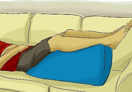 Elevate your feet while resting. If you have a job where you sit most of the time, try to raise your feet up when you're sitting. By raising your feet above your heart, you're making your circulatory system work less hard to get the fluid up from your feet. You don't have to have your feet elevated all day; just try to do it a couple of times a day. It may also help to have them elevated at night. If you have a desk job, ask your boss if it's appropriate to use a footstool at work. When elevating your feet, try not to cross your ankles or legs because that can put too much pressure on veins and restrict blood flow. When you elevate your feet, you're allowing gravity to help pull the swelling back in toward your body from your feet, so it can be reabsorbed into your lymph system.