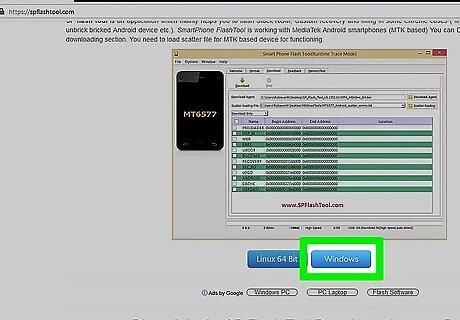 Click the "Windows" option. This is directly below the SP Flash Tool screenshot in the middle of the page; clicking this option will prompt your SP Flash Tool file download. If you're running Linux, you can click the "Linux 64 Bit" option instead.