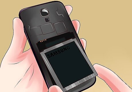 Power down your phone, then remove the battery. Your Samsung Galaxy S4 battery is located under a sliding panel on the back of the phone. You can power down your phone by holding down the power button, then tapping "Power Off" when prompted.