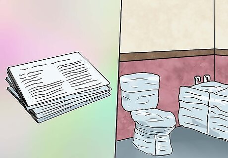 Cover anything that isn't getting renovated with plastic or paper to protect it. If you are painting your bathroom, you will want to cover the floors, sinks, counters, toilets, and light switches so that they don't get dirty. You can use paper, cardboard, or plastic sheeting. Be sure to tape the edges down so that the paint or dust doesn't get underneath is. If you are removing any knobs, faucets, light switches, or towel rods, be sure to put them into a box so that they stay together. This is especially important if you plan on using these items again. Shut the door when you’re finished working for the day so pets or children don’t get inside while the bathroom is still under renovation.