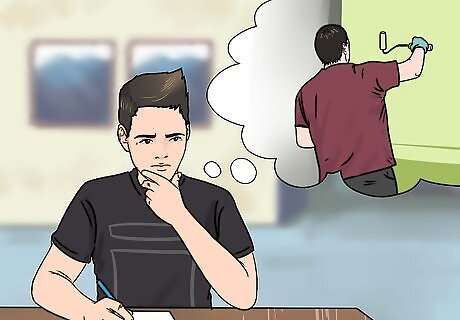 Choose moisture and mildew-resistant paint. Because bathrooms get damp, wallpaper is not a good idea. The best paint to use for a bathroom is something that is either semi-glossy or satin; both are resistant to frequent cleaning and touching. Textured paint is also a great option if you are re-painting an old surface; the texture will conceal any bumps and imperfections. Whatever paint you decide to use, make sure that it is intended for bathrooms, and is both moisture and mildew proof. Use light colors, such as sky blue, seafoam green, or lavender, if you have a small bathroom. They will make your bathroom appear bigger than it actually is. Use darker colors to make large bathrooms appear smaller and cozier. Go for gray or white if you can't decide. They are common bathroom colors. Consider adding accent or trim colors to match your decor and towels.