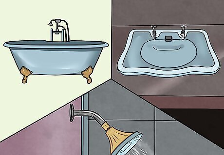 Choose your bathtub, sinks, showers, and other fixtures. There are different types of tubs, sinks, and showers. For example, some types of sinks and tubs are free-standing and can be moved around if needed. Other types are directly molded into the counter or wall. Here are some things to keep in mind: Pedestal sinks look elegant and take up little space, but they won't fit in a counter, and you can't place a cabinet under them. You will need to install cabinets and counters in other parts of your bathroom. This could also decrease the value of the bathroom if you ever plan on selling your home. Vessels and bowls are popular sink choices. They sit right on top of a counter. The downside is that you will need to clean under them, and you can't just wipe things off the counter and into the sink like you would with a molded sink. They also tend to be more expensive than molded sinks. Molded sinks are often set right into the vanity. They are the most common, but also the most convenient. Claw-foot bathtubs are free-standing and classical. They are often made from porcelain and can hold heat better. You will need to add a drain in the floor to catch any spilled water. Molded bathtubs sit right on the floor, and are the most common. They come in all sorts of shapes and sizes. Some even include fancy features, such as benches for shaving on and jet streams. Measure the size of your doorframes to make sure the fixtures you want can fit inside easily. When you go to buy a bathtub, you might also want to sit in it to make sure that it is comfortable. After all, you will likely sit in your bathtub while using it at home.