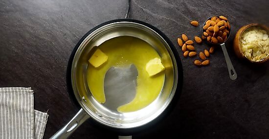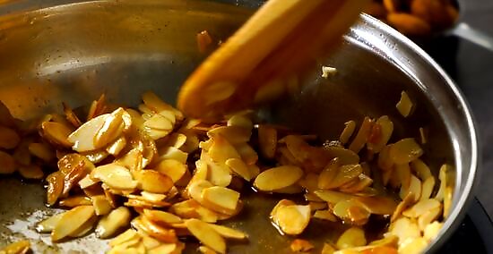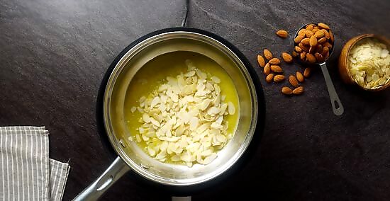 Roast the almond slivers in the pan for 3-4 minutes. After 3-4 minutes, the almond slivers should look light brown and roasted on the outside. Once the almonds are roasted, turn off the burner.