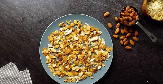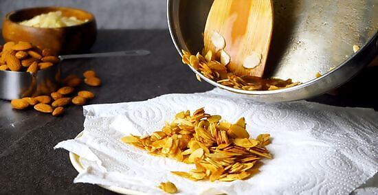 Transfer the almond slivers to a plate with a paper towel on it. Let the almond slivers cool for several minutes. Once the almond slivers are slightly cooled, they're ready to serve.