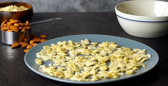 Spread out the almond slivers on a microwave-safe plate. Use a spoon or spatula to spread out the almonds so they're in an even layer.