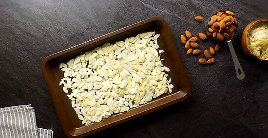 Spread out the almond slivers on a baking sheet. Don't worry about lining or greasing the baking sheet. Make sure the almond slivers are in an even layer.