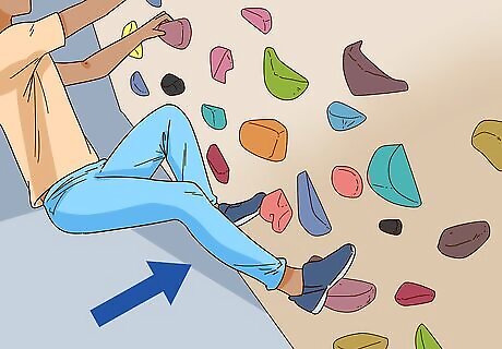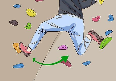 Push off of the wall to boost yourself to the next hold. As you press down on the rock, you generate force with your leg similar to heel holds and other climbing techniques. Use your momentum to push yourself up. Keep your body close to the wall with your arms straight as you reach toward the next holds. Follow up by bringing your other leg and arm up to the next holds. This technique can be a little intimidating at first, so practice it in a safe location. Try using a smooth boulder or visit a gym with big handholds.