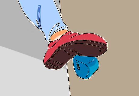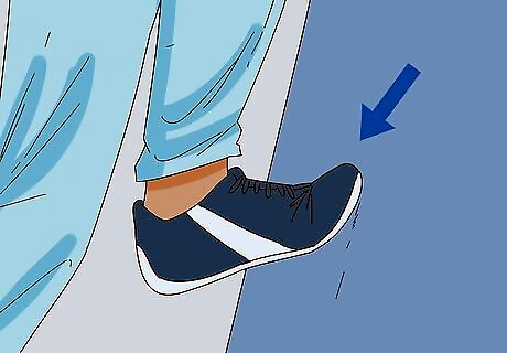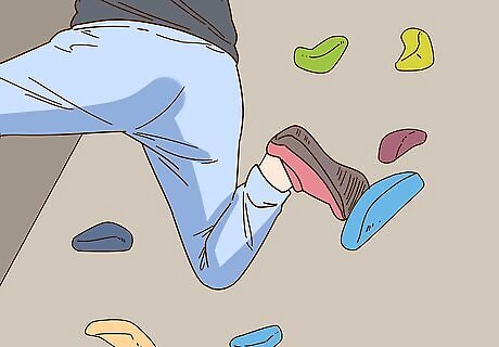 Check the hold for a rough surface to plant your feet on. Examine the hold to identify any bumps, dips, or other spots to catch your shoe on. Try to maximize your contact with the hold as much as possible to ensure you get a good grip on it. Before attempting to make your move, thoroughly plan out where you intend on placing your foot. Accuracy is very important, especially if you’re stuck in a difficult spot. Good shoes are a must for holds. You need shoes that fit you snugly and have stiff patches of rubber on the toes and heels. Tie your shoes well so the laces or straps don’t get in the way of your foot placement.