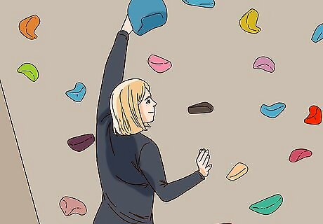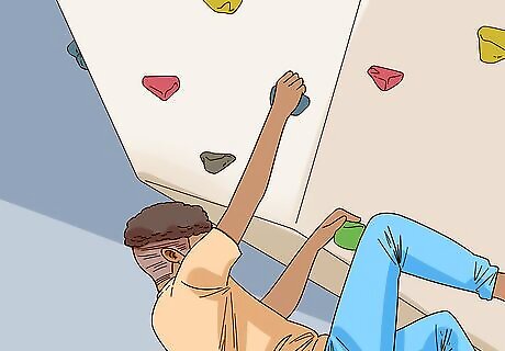 Turn your shoulders and hips whenever you reach for a hold. Instead of twisting your arms, turn your body to face the spot you wish to reach. Even though this may seem like it extra work, it actually saves your strength. Turning your body improves your balance and keeps pressure on your legs instead of your arms. Climbing is a dynamic activity, so use your entire body as much as possible. For example, if you’re reaching for a hold with your left hand, plant your right foot. As you raise your left foot, turn your left shoulder and hip toward the hold. If you’re uncertain about how to do this, watch an experienced climber.