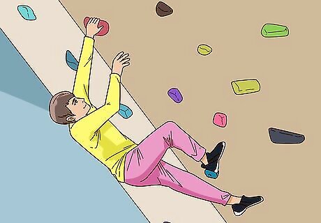 Climb at a steady rate with your feet close to your hands. One of the biggest mistakes beginning climbers make is trying to get up an overhang too quickly. When you rush, your feet slip and poor footwork means more stress on your upper body. Keep your knees bent so you don’t reach for holds too far ahead of you, then move at a comfortable but consistent pace. You’re going to get tired during an overhang climb, but a good climbing technique improves your endurance. Master your technique by practicing on regular climbs and safe overhangs, such as in a gym. Heel holds and toe holds are useful leg techniques to master for overhang climbs. Make them a part of your routine to improve your climbs.