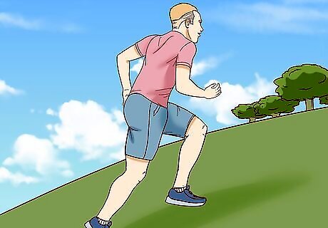 Add hill work to strengthen your legs. Find a hill preferably about 300 metres (980 ft) in distance with a 4-8% incline grade and sprint up the hill. Walk or jog back down the hill to recover, and repeat. Do as many intervals as you can, gradually increasing the number of intervals you perform over time. Hill runs should only be done about once a week to best avoid injury. If there aren't any hills around you, you can also perform this exercise on any treadmill with an adjustable incline.