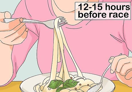 Eat a light meal and drink lots of water a few hours before the race. Stick to low-fiber foods containing protein and easily digested carbohydrates. Avoid eating more than 200 calories in the 2 hours before the race. To avoid dehydration, drink about 16 fluid ounces (470 mL) of water in that same time span. Examples of good foods to eat before your race may include pasta, rice, and processed grain products like bagels.