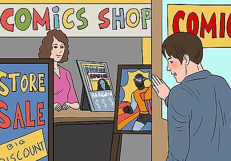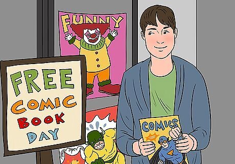 Take advantage of Free Comic Book Day on the first Saturday of May. Free Comic Book Day is a holiday in the world of comics, and it is always on the first Saturday in May. On this holiday, anyone can walk into a comic book store and get a free issue of a comic. Stores often hold their own promotional events alongside Free Comic Book Day, so check with your local shop to see what specials they will have.Tip: The free comic book is the same for everyone, so you can’t go in with a bunch of friends and pick different comics. The comic book that is free is always related to a major comic book film that comes out later in the year.