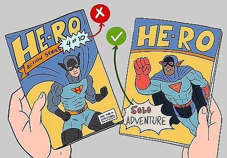 Avoid serial comics and buy single-story issues. Serial comics are any monthly or biweekly issues that continue a single storyline over a longer period of time. If you buy these issues, you will be tempted to purchase the upcoming copies of the story arc to find out how it ends. Avoid this by only buying self-contained stories that finish a story arc within a single issue. To tell if a comic is a serial, read the cover to see if says something like “issue number 4 out 10” or “a serial story.” You can also flip quickly to the back panel and see if the last panel contains “to be continued.”