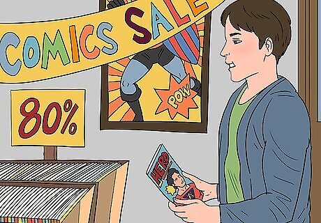 Wait for sales at your local comic shop. Comic book retailers frequently host sales when business is slow or a new major release is coming out and they need to get rid of some inventory. Look at your local shop’s calendar or ask the clerk behind the desk about upcoming sales and save your money up to buy a bunch of issues when the sale is active. Comic store sales are often based on themes. Common examples may include discounts on Marvel comics, books written by female authors, or comedic issues from smaller presses.