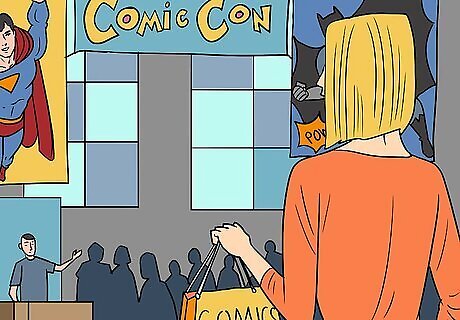 Attend conventions and comic shows and pick up overstock. While conventions and comic shows tend to highlight the rare and expensive issues on sale, they’re also an opportunity for shops to unload their bundles of undersold issues. Comic shows and conventions can be an excellent opportunity, especially if you’re willing to purchase a lot of comics at once, since you’ll have access to a lot of variety. You usually have to pay an entry fee or buy a ticket to get into these conventions, but general admission tickets tend to be pretty cheap.