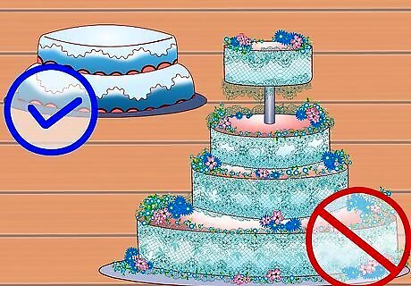 Choose simple flavors. Specialty cake and frosting flavors and seasonal flavors are more expensive than simple flavors. Simple flavors include vanilla, chocolate, and lemon. Specialty flavors include flavors such as red velvet, carrot cake, or seasonal flavors. If you want to use specialty flavors, use them only for the smaller tiers. For example, you could use vanilla for your largest tier and red velvet for a small tier. Also limit your cake to two flavors and two fillings. Your baker will likely charge you more for three or more.