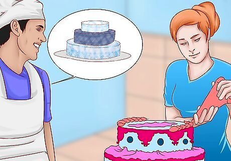 Bake your own cake. If you, your family, or your friends are good at baking, consider baking the cake on your own. If you are baking the cake yourself, look for recipes that freeze well so you can bake the cake ahead of time. If a friend or family member is baking the cake, ask them to make your cake at a discount or even better, it could be their wedding gift to you. It is a risk using an inexperienced baker. You should do a trial run before the wedding. The test cake should be the exactly like your real wedding cake. If you go the do-it-yourself route, have a backup plan just in case.