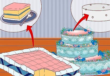 Use a display cake. Ask your baker to make a one or two-tier cake for you to cut and bake a sheet cake to serve to your guests. You could save about 20% per slice if you use this method. The cake table will be a little empty because your cake is small, but think of this as an opportunity to decorate your table. The table can be decorated with flowers, candles, or a beautiful table cloth. You can also get a decorated base board from your baker.