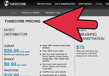 Consider the upfront cost of your aggregator. Click on the button labeled “Pricing” on the homepage of most aggregation sites. Music distribution companies charge a flat fee, take a cut of your royalties, or a combination of both. General upfront costs include: ’’’Single Songs:’’’ $10-$15 per song. ’’’Albums:’’’ $20-$60 per album (first year) Some companies charge annual fees to keep you album on iTunes, usually $40-$50 each year.