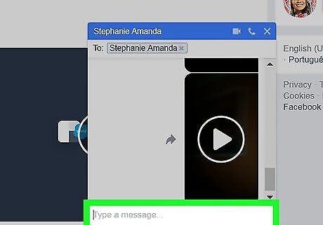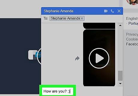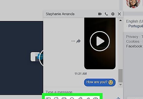 Add items to your messages if you like. You can send photos, stickers, or other content through Facebook as well: Photos — Click the "Photos" icon in the bottom-left corner of the chat window, then select a photo from your computer. You can press ↵ Enter to send the photo. Stickers — Click the "Stickers" icon to the right of the "Photos" icon, select a sticker category, and click a sticker to send it. GIFs — Click the GIF button at the bottom of the chat window, search for a GIF to send, and click the GIF you want to use to sent it. Emoji — Click the smiley face icon at the bottom of the chat window, find an emoji you want to use, click it to type it, and press ↵ Enter to send it. Money — If you have your Facebook payment information set up, click the $ icon at the bottom of the chat window, select a friend's name if you're in a group chat, enter a payment amount, and click Pay. Files — Click the paperclip icon at the bottom of the chat window, select a file from your computer, and press ↵ Enter to send the file.