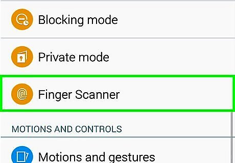 Access the fingerprint manager. In the Settings menu, you will have a list of customization options for your device. Scroll down the list until you see a fingerprint icon labeled “Finger Scanner.” The icon will have a blue-colored circular background if you are on the galaxy S5 and an orange one if you use a Note 4.