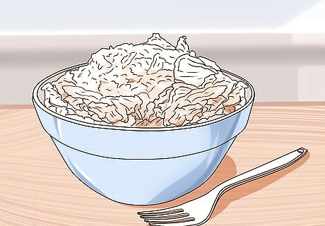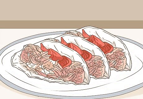 Prepare shredded chicken tacos. Obtain some taco shells. You can use either hard or soft shell. Pour two teaspoons of vegetable oil in a small nonstick pan over medium heat. Add a tablespoon of minced onion. Sautee two minutes. Then add one pound of shredded chicken, one pinch of cumin, one pinch of chili powder, and ¼ cup of tomato sauce. Mix everything together and turn the heat up until the mixture boils. Then reduce the heat to low and let the mix simmer for about three minutes. Scoop some of the mix onto your taco shell. Top with cheese, mushrooms, cilantro, or diced bell peppers to taste.