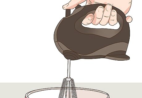 Shred chicken with a hand mixer. Place your chicken pieces into a sturdy pyrex or glass mixing bowl. Most mixing bowls can accommodate up to two chicken breasts or thighs. Place the prongs of your mixer into the bowl. Turn the mixer on a low setting. Use one hand to grip the bowl and one hand to move the mixer around. Move the mixer around the bowl until the chicken is fully shredded (usually about 60 seconds or less). Keep the mixing paddles in the bowl while they’re moving, otherwise you’ll end up flinging chicken all over your kitchen. When your chicken is shredded, turn the mixer off and remove it from the bowl. If you have more than two pieces of chicken, shred them in batches. For instance, shred two piece of chicken, then remove them onto a plate or bowl. Then drop two more pieces of hand-torn chicken into the mixing bowl and shred again.