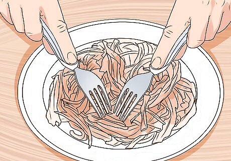 Shred the chicken with a fork. On a plate or in a bowl, pierce a piece of boneless chicken with two forks. Both forks should have their prongs facing in a downward curve. Press the prongs of one fork into the center of the chicken and apply a firm downward pressure. With another fork, pierce the chicken near the place where the prongs of the first fork penetrated. Then, pull the second fork away from the first in a straight line. Don’t simply remove it at the same angle you entered the chicken. Rather, pull straight away relative to the plane of the bowl or plate the chicken is on. By pulling the second fork away from the other fork, a significant portion of the chicken meat should come away with it. You might notice the meat is stringy and breaks into thin strips. This is normal. Pierce the chicken again with the second fork and continue to tear away chicken meat. When you’ve torn up most or all of one side of a piece of chicken, remove the first fork you’re using to anchor the chicken in place and pierce the new center of the piece of chicken you’re shredding. Continue in this way until all the chicken is shredded.