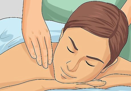 Give yourself a massage with essential oils. Giving yourself a gentle massage with essential oils before bed will help relax you and relieve tension. Applying some essential oil to places such as your feet and temples can have a similarly calming effect. By applying these essential oils your body, you may help yourself fall asleep more quickly. If you are using essential oil for a massage, make sure to mix it with a carrier oil so you don’t burn your skin. Make sure to keep the massage light or else you’ll stimulate your circulation and have a hard time falling and staying asleep. Consider massaging the essential oil into your wrists, feet, legs, or on your temples.