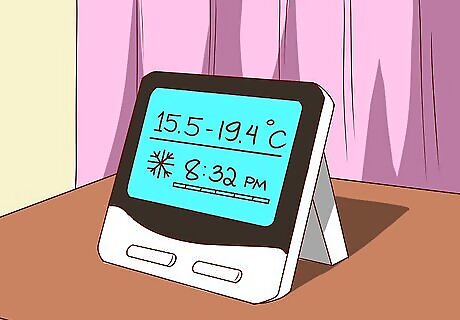 Keep a dark, cool room. Your bedroom should be a room that makes it easy to relax and fall asleep. Bright lights upset your body's circadian rhythm, which is why it's important to sleep in as dark a room as possible. That may require thicker curtains or blinds to block out any outside light, and leaving a fan or air conditioner on (or a window open) to keep it cool. Optimal sleep temperatures range between 60 to 67 degrees Fahrenheit (15.5 to 19.4 degrees Celsius). That's because your body temperature lowers slightly when you sleep, and being in a cool room may help initiate the process. Use curtains or blinds to block outside light, and turn off all artificial lighting in your room. If it's still to bright (say, if you work at night and sleep during the day), consider buying a sleep mask. They're fairly cheap and can be found online or at many retail stores. Try to block out as much outside sound as possible. If need be, you may have to sleep with some type of white noise, like a fan or white noise machine. Earplugs can also help, if you live in a particularly noisy neighborhood.