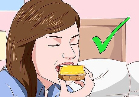 Avoid big meals before bed. Eating a large meal or a spicy meal before bed can cause indigestion, which in turn can make it difficult to sleep. Try to avoid eating large or spicy meals for two to three hours before going to sleep, if possible. If you really want something to eat, opt for a light snack no closer than 45 minutes before you intend to go to sleep. This will help fill you up without causing indigestion. Some good light snack options include: deli slices of turkey warm milk toast with peanut butter crackers and cheese cereal or oatmeal yogurt and fruit