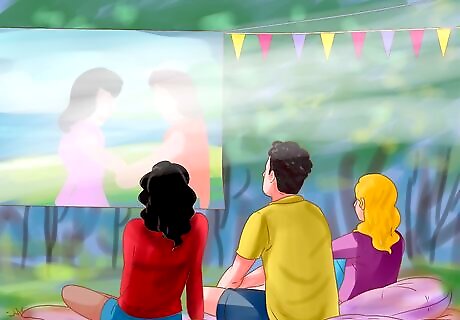 Have an outdoor movie night with snacks and drinks. You’ll need a projector, speakers, and a screen or an area that’s big enough to project the movie onto. Bring out blankets, pillows, and chairs for people to sit on. Make popcorn and provide some other snacks and drinks. If you don’t have a screen, project the movie onto a garage door or something similar. This is also a fun way to watch baseball games with your friends if you can’t make it out to the field.