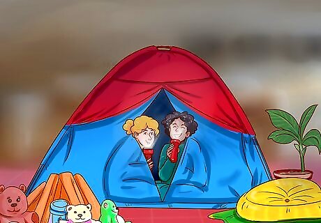 Camp indoors for a fun overnight activity when the weather is bad. Instead of letting the rain ruin your plans for a campout, bring the tent indoors and mimic all the activities you’d normally do. Set up the tent, bring out a sleeping bag, and pack yourself some snacks to enjoy. If you have friends with you, tell ghost stories or play cards. You can even make s’mores on the stove or in the microwave—just make sure you have permission to use the stove first!Tip: Instead of using the overhead lights or lamps, use flashlights to mimic the feeling of being outdoors.