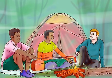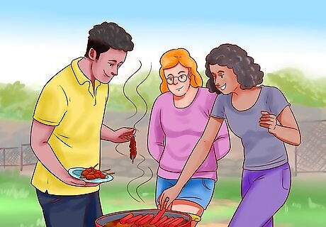 Invite your friends over for a cookout and enjoy eating outdoors. If you don’t know how to operate a grill yourself, you’ll need someone to help you with that. Generally, cookouts include hamburgers, hotdogs, or sausages, snacks like fresh fruit, vegetables, and chips, and drinks, but you can be as creative with the menu as you want to be. If you don’t have a grill, move your cookout to the park to use one there. To make your cookout even more fun, ask each friend to bring along one of their favorite dishes. Apart from eating, you can also play backyard games, take a walk, or even have a bonfire once it’s nighttime.Tip: If you’re worried about mosquitos and other bugs, light citronella candles to help keep them away.
