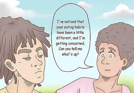 Talk to your teen. If you're concerned your teen may have an eating disorder, the first step is talking to your teen about your concerns. This requires a good deal of tact, since teens may quickly get defensive or even aggressive if confronted about an eating disorder. Let your teen know about any concerning behavior you've seen or heard. Use "I" statements and avoid direct accusations. For example, instead of saying, "You have an eating disorder," say something like, "I've noticed that your eating habits have been a little different, and I'm getting concerned. Can you tell me what's up?" You may need to approach your teen several times before you get an honest answer. It's not uncommon for teens to lie about not having an eating disorder and insist that everything is fine.